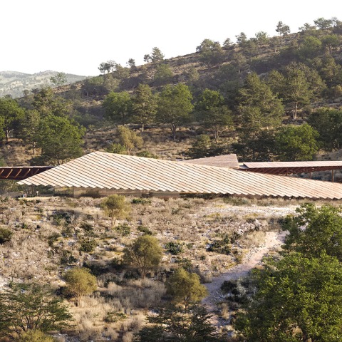 Visualización. Centro de Visitantes del Parque Nacional Butrinto por Kengo Kuma & Associates. Essentially, the design for the visitor centre consists of a series of limestone roofs emerging from the ground, inspired both by Albania’s beautiful stone monuments, gates and bridges, and by the surrounding natural rock formations. Albanian vernacular architecture is also apparent in its hybrid structure between mass timber and steel, which reinterprets the traditional cross-wood structure used to support the roof stone canopies in the south of the country.