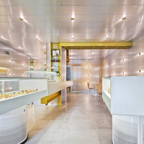 IDEO Arquitectura wanted to put the final touches on the cake-jewel concept, and the selection of colour was absolutely crucial. They opted for a range of golds, finally choosing the colour PANTONE 118, ochre with golden tints, responding better to the sobriety of Eric Ortuño's style. At the first painting phase, all of the bakery walls were painted in this colour. Then after placing the second interior polycarbonate skin, it was immediately also soaked in the same colour, reverberating the ochre-gold throughout the whole space.
