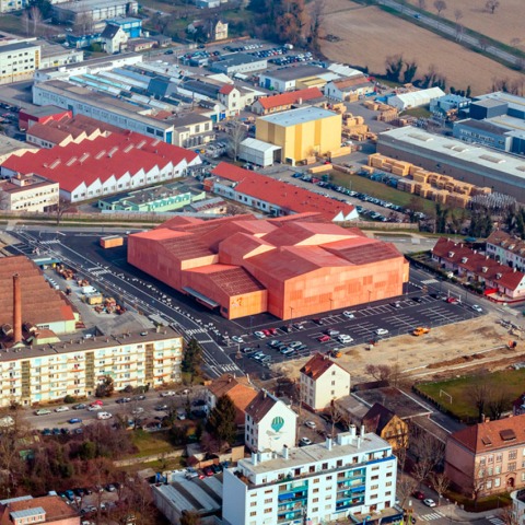 The inspiration has come from the context, which combines big orangey interlocking tile roofs with some industrial brick chimneys reminding the industrial past of the site. We used a specifi c varnish which we designed and tested with Akzo Nobel: this is a translucent varnish which enables to keep the vision of the expanded metal panels shiny aluminum in the background, in which the manufacturer inserted some pigments containing copper powder.
