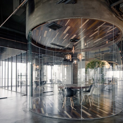 The tone of the entire space is designed to be raw to depict the creation process of ideas. Reflective concrete finishing has been applied to the entire open work space to reflect outdoor light to the inside. Ceiling is treated using concrete paint resembling the floor finishing, thus the lighter concrete finishing on the walls and columns dramatically brightens up the space and merges into the transparent clear glasses extending the space to the outside. Offices, meeting spaces and shared meeting points are highlighted using solid wood as “the ‘accent’ painted on the raw canvas”, giving a buffering and slower rhythm into the movement and providing transitional zones into the spaces.