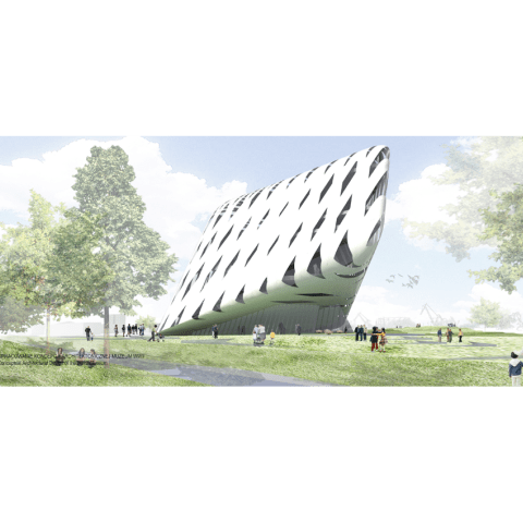 The architectural object ends up becoming soft in its vertices and edges as a big gummy bright white, contrasting with diamond scratched skin envelope that leads to pain and suffering that marked the moment in history.