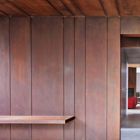 A new fence of cor-ten steel plates closes the house to the outside, and according to the angle, closes or opens the house in view of the passerby.