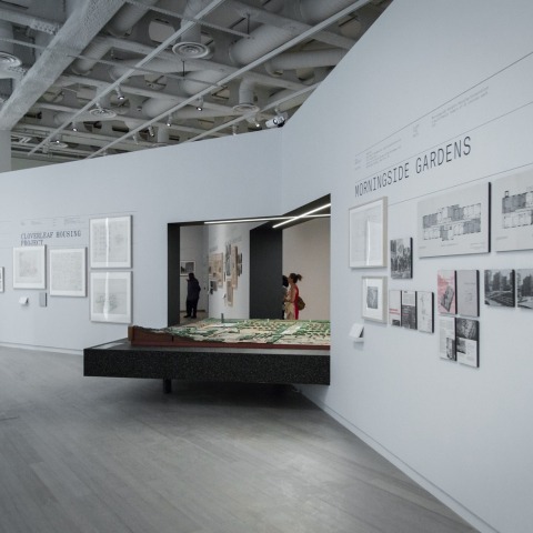 The exhibition’s narrative takes the form of two interwoven plotlines, developed through displays of project-specific drawings, photographs, and other material dating from the late 1920s to the late 1950s. One plotline tracks the Broadacre scheme as it plays out in Wright’s subsequent work, scattered around the country; the other tracks the development of public housing in Upper Manhattan’s Harlem neighborhood, ending just outside the gallery, adjacent to Columbia’s new campus. Both stories connect social institutions, such as the nuclear family, with economic structures, such as private property or its alternatives. Wright’s version of the “American Dream” and Harlem’s public housing both draw lines of race, class, and gender, many of which persist today. Their differences remind us that the right to housing once defined, and could still define, what it means to live in America.
