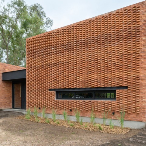 The exterior of the construction is completely clad in exposed brick arranged in such a way that the envelope acquires a special role. The pieces were made by local artisans with careful quality control. The arrangement of the bricks achieves a three-dimensional envelope activated by the play of light and shadow from the sun on the wall.