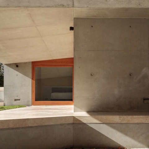 The south facade of the house is the “face” of the long housing block. A monolith in exposed concrete that develops on 4 floors, seeking on each floor to establish different relationships with the water tank, the garden and the view towards the river.