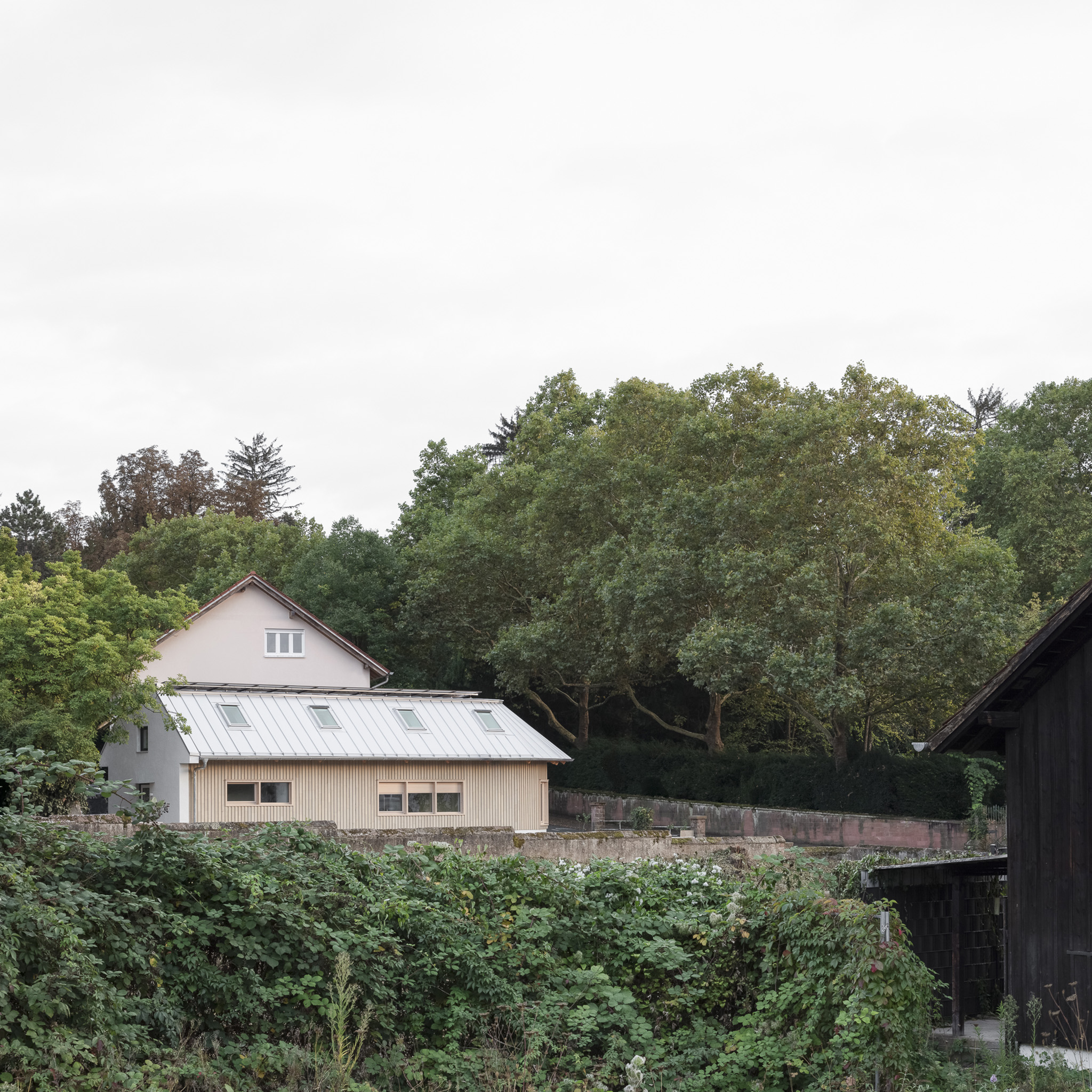 In addition, a photovoltaic system, an air-source heat pump and a rainwater storage tank support the building’s resource-efficient operation. In the garden, materials from the former workshop were reused, including a historic gravestone slab incorporated as a sculptural element.