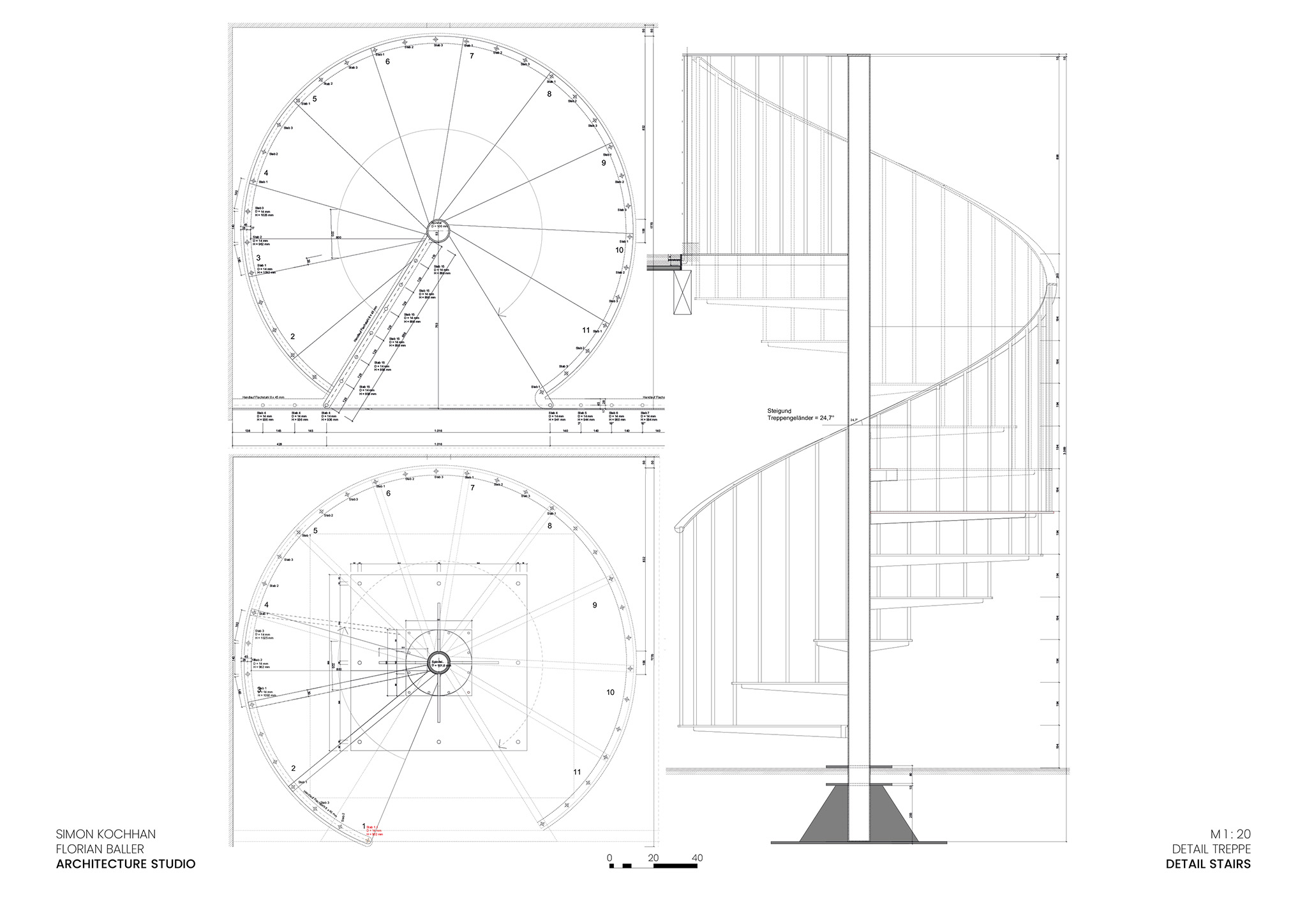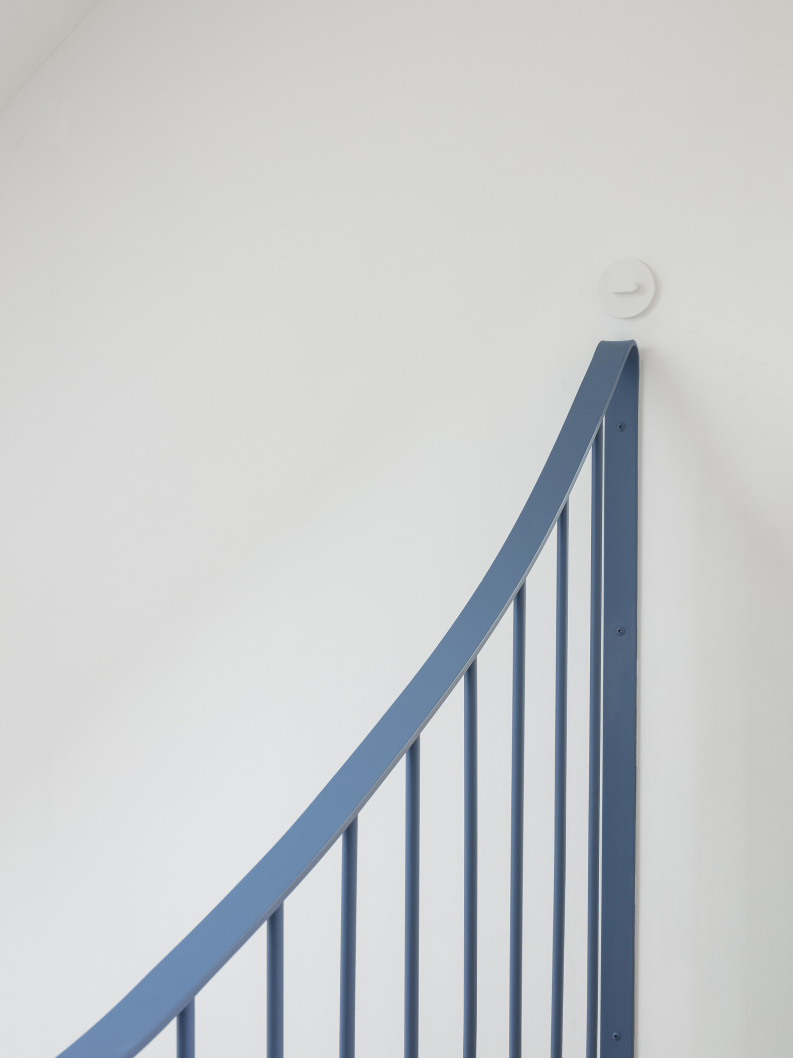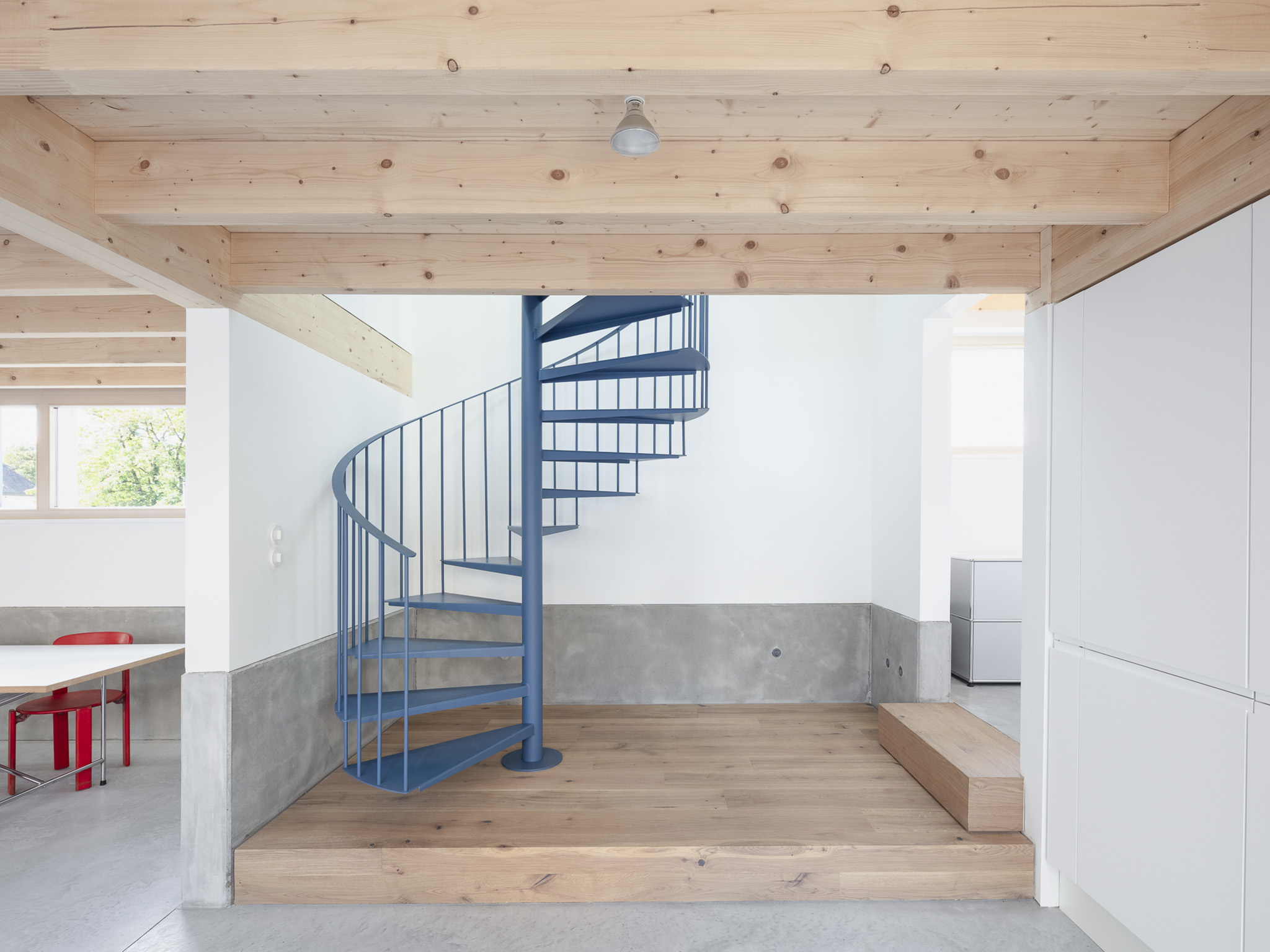 Structurally, the building is constructed in timber frame construction with recycled insulation and wood fibre boards. An exposed concrete base and polished screed floor define the material character of the interior. Timber windows with external protective frames and uniformly blue-painted steel elements – including a handcrafted spiral staircase – highlight the project’s attention to detail and craftsmanship.