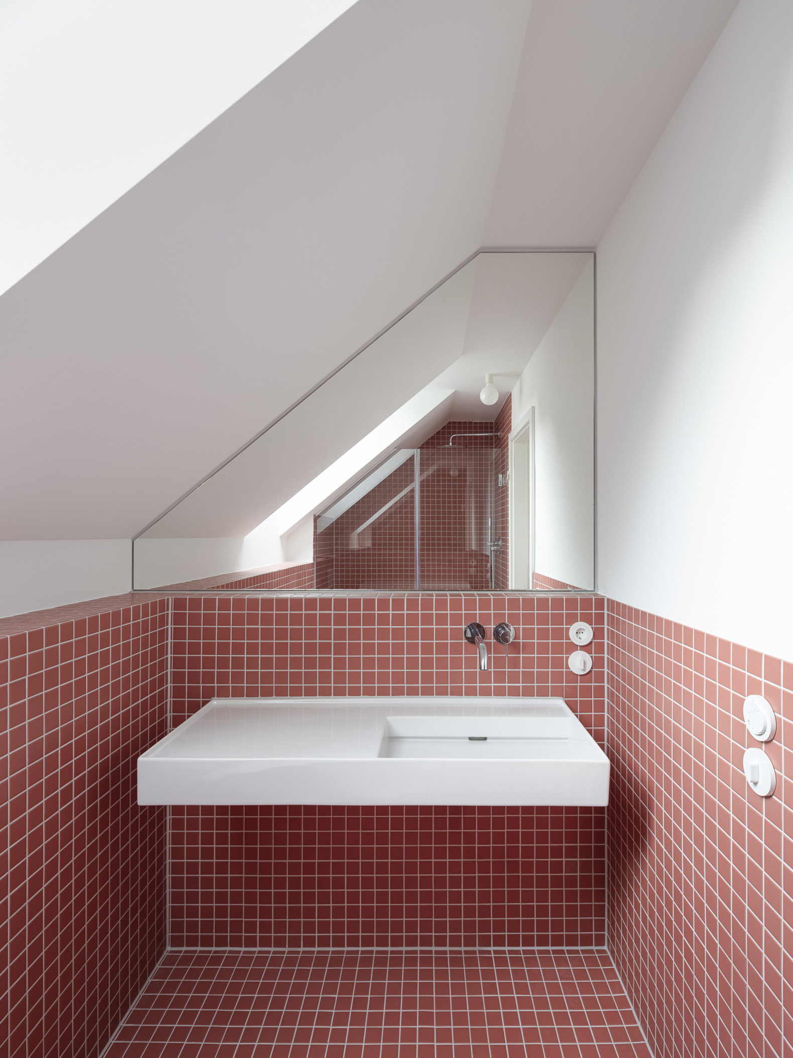 Inside, the seemingly symmetrical entrance arrangement gives way to a deliberately asymmetric spatial sequence. Circulation is guided by carefully positioned openings that bring natural light deep into the interior. Communal spaces are located on the slightly sunken ground floor, while the private rooms are compactly organized on the upper floor. Two double-height spaces create visual and spatial connections between the levels.