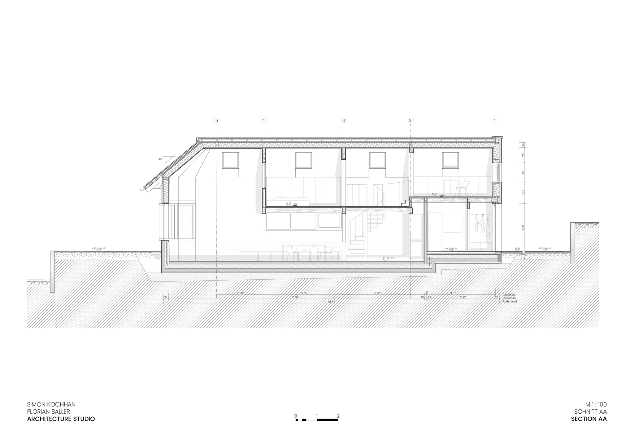 From the outside, the project by Simon Kochhan and Florian Baller appears to suggest symmetry. However, upon entering the house, the visitor encounters a sequence of intentionally asymmetrical spaces. The exterior conveys a sense of seclusion and privacy; inside, a homogeneous natural light floods the rooms, creating a warm and welcoming domestic atmosphere.