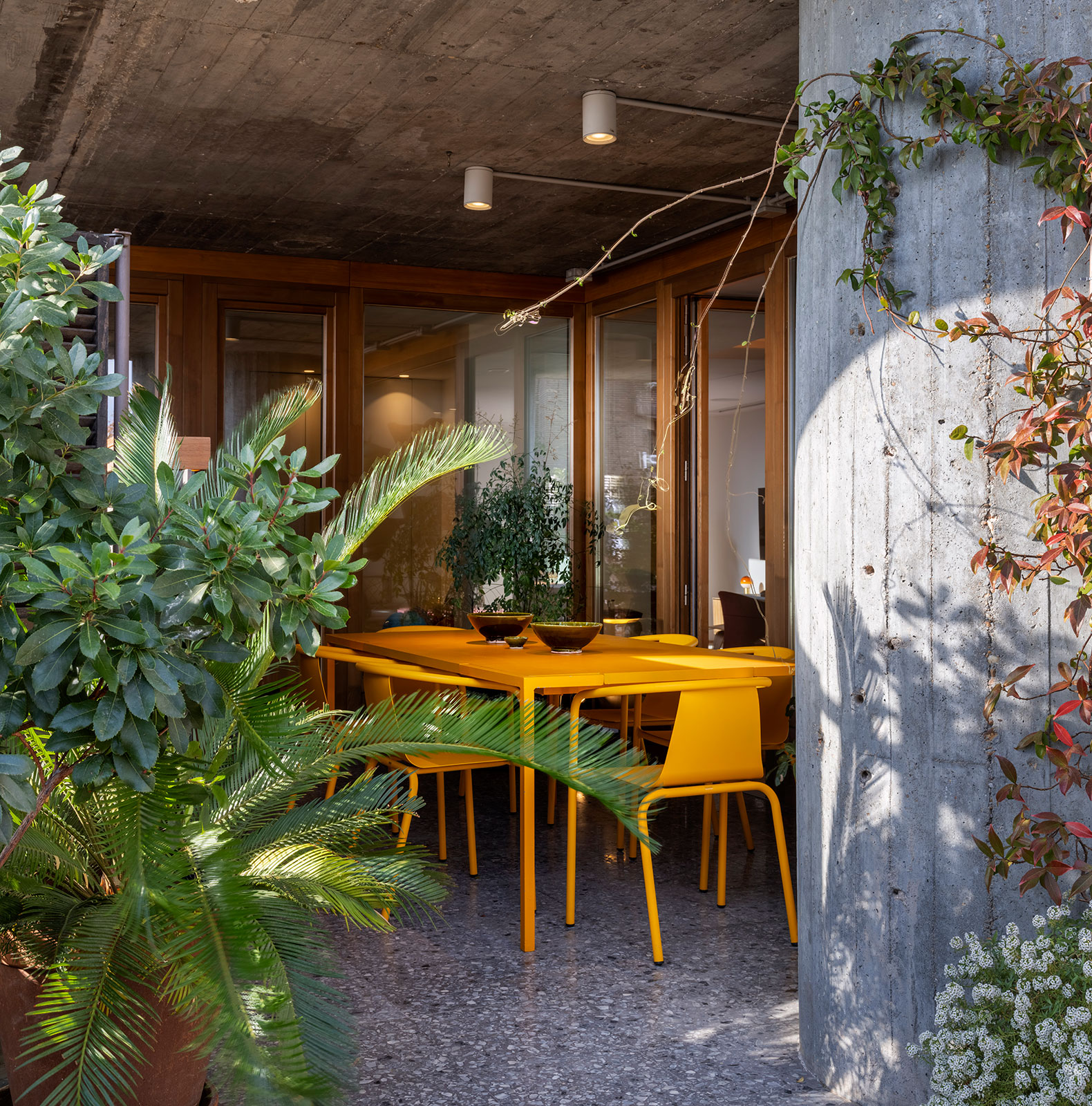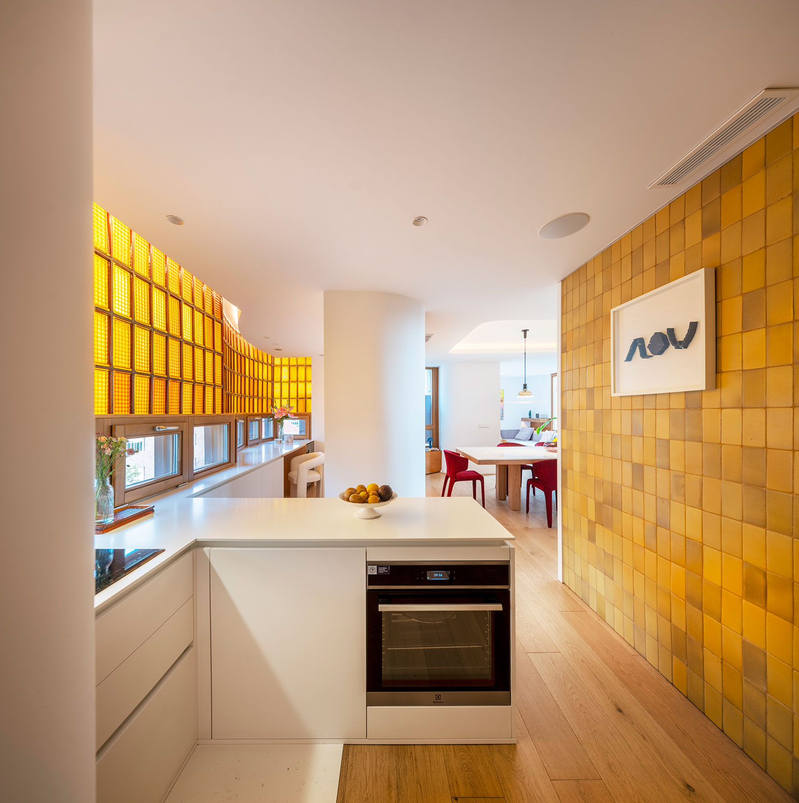 The original spirit of the house is restored by re-establishing the connection between interior and exterior, with all the rooms opening onto a continuous terrace where a new garden has been created. In the interior layout, the service area has been eliminated and integrated into the living area, generating spacious and dynamic spaces. Furthermore, iconic original elements have been preserved, such as the yellow tiles in the bathrooms, the exterior shutters, the yellow glass blocks, and the dumbwaiter.