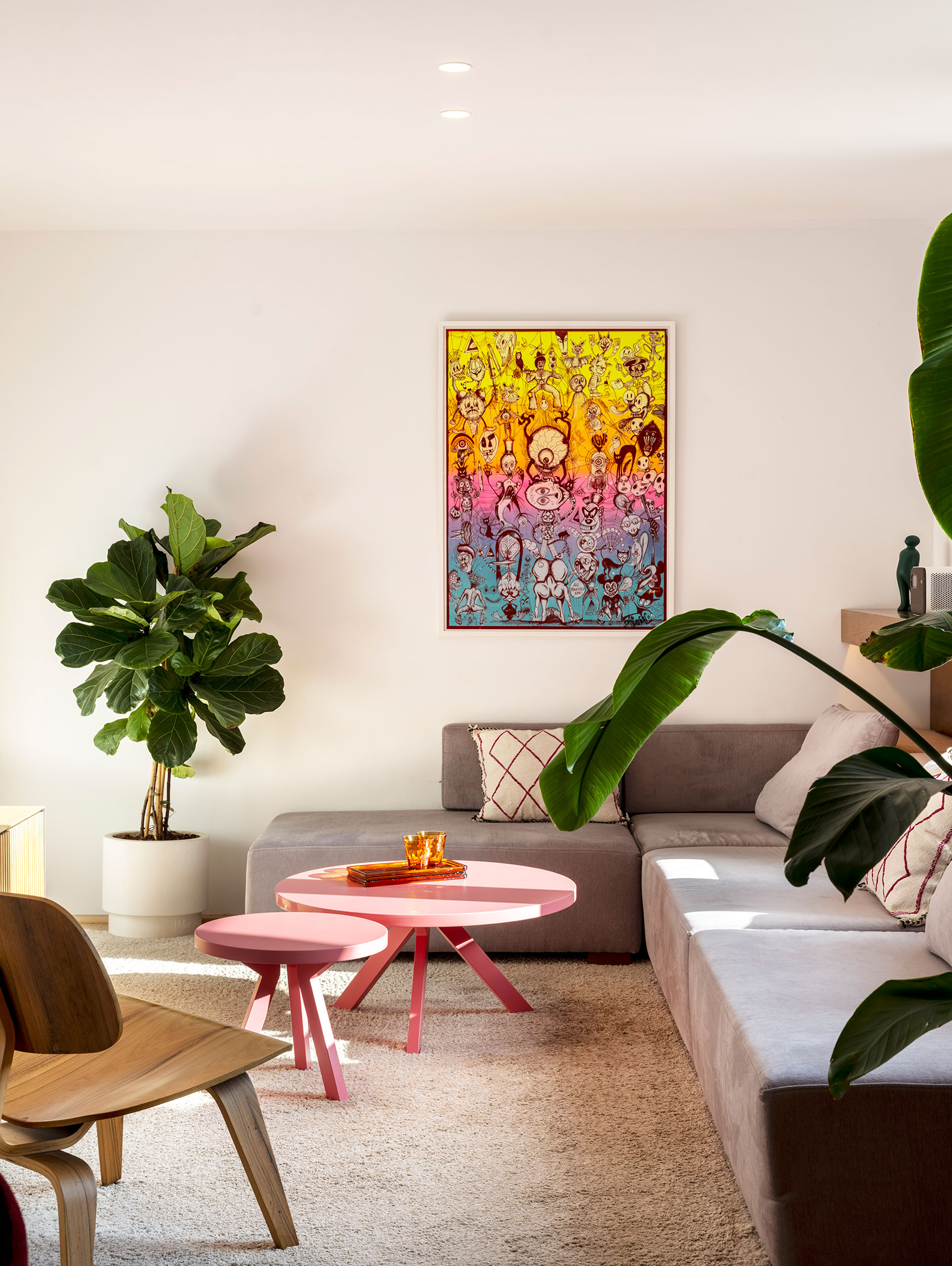 Finally, we reinterpreted other original features, such as the solid wood horizontal baseboards, the curved corners, the wooden radiator covers, and the curved ceiling moldings.