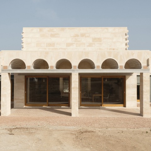 An ambulatory occupies the perimeter of the patio and connects the different rooms. The proposal adapts to the topographic gap that exists between the front and back of the site. The exterior material is marés, the sandstone that defines the built landscape of Mallorca, and the interior is ceramic brick produced with local clay.