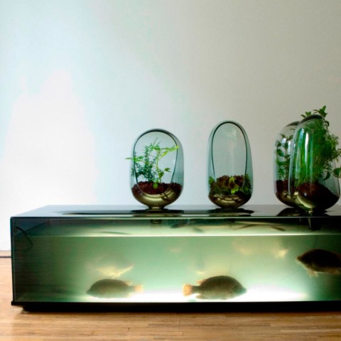 Local River anticipates the growing influence of this group (the word ‘locavore’ made its first appearance in an American dictionary in 2007) by proposing a home storage unit for live freshwater fish combined with a mini vegetable patch. This DIY fish-farm-cum-kitchen-garden is based on the principle of aquaponics coupled with the exchange and interdependence of two living organisms – plants and fish.
