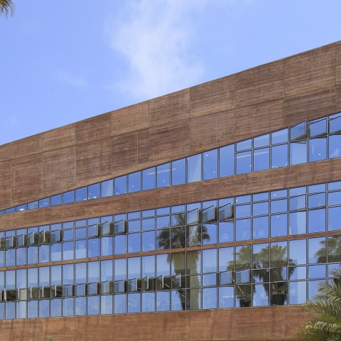 A building that is defined by its wall condition and texture, whose materiality is characterized by concrete with a reddish pigmentation that, according to the architects, “calibrates its mass” and allows it “in apparent opposition its transparency”.