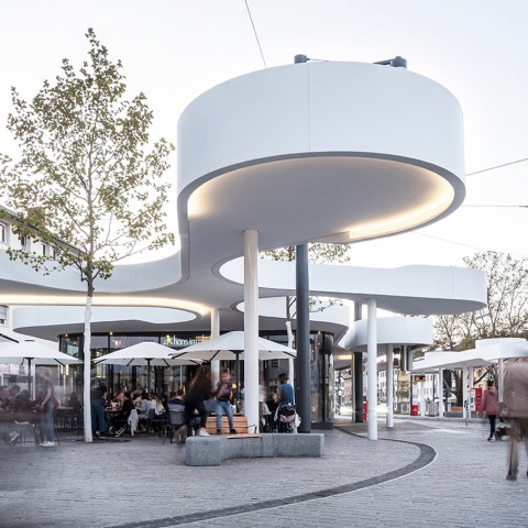 The ‘pavilion’, named after the public square on which it is located, is defined by its organic shaped roof canopies. J.Mayer H.’s signature curved forms unite the program, two public transport stations, and a new restaurant.