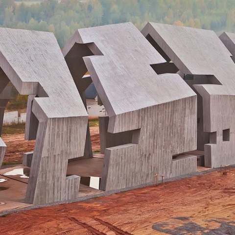 Mirosław Nizio and his studio Nizio Design International envisage the building as a traditional hut that incrementally deteriorates and crumbles into dust – symbolising the burning of the village.