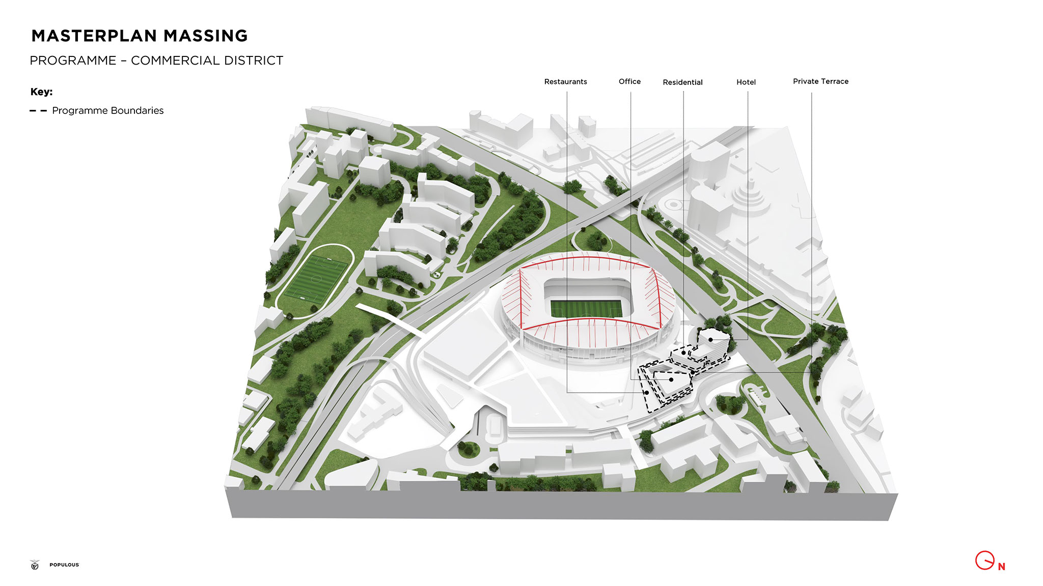 The proposal, led by Populous and Saraiva + Associados, aims to modernize the Estádio da Luz facilities and incorporate new venues, services, and public spaces into the surrounding area, creating a valuable civic asset for the residents of Benfica.