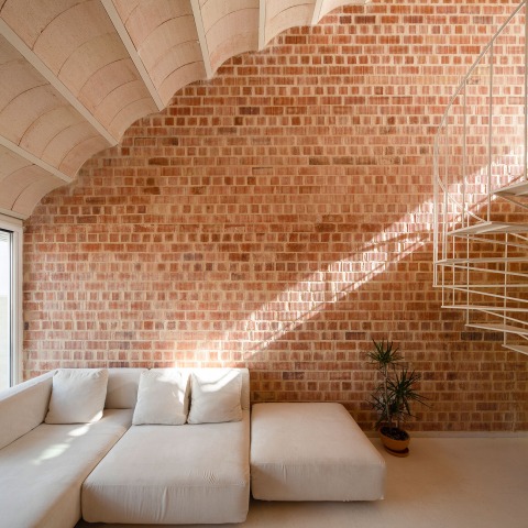 On the other hand, the decision to situate the night-time and service areas on the lower levels of the dwelling allowed for the inclusion of a singular space of greater height that would visually connect all the exterior spaces of the plot, using a direct and continuous gesture formalised as a vault that simultaneously embraces and decompresses the space. In turn, light clay ceramic vaults, used as formwork for the roof of the dwelling, complete the interior envelope without any other cladding than the scant natural lime rendering that covers the walls fitted with installations in the wet areas.