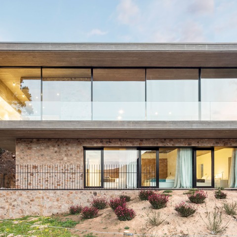 The building is integrated into the environment reducing its presence to a volume of concrete, which corresponds to daytime spaces. The rest of the elements that complete the program of the house are materialized by means of the stone, thus they are perceived as stony volumes arising from the land and minimizes the impact of the building. The interaction between the volumes generates a closed patio protected from the wind, from which you can enjoy the surroundings through a succession of spaces that dilute the interior and exterior of the house, turning them into just one space. With this solution of opening the day area to the landscape and to the garden, the fact of achieving the south orientation to the main piece is also resolved. It was also possible to create a garden with a pool in which to enjoy the sun for as many hours as possible.
