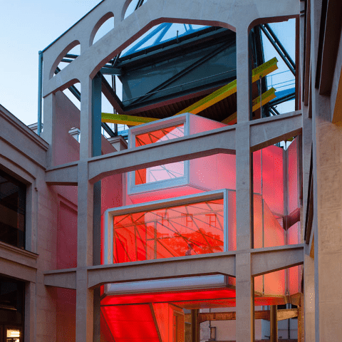 - Looking at each new intervention as an opportunity to incorporate support systems for creative actions and research. This included solutions such as the use of double blinds as projection screens, taking advantage of voids in the existing structure to create a retro-projected floor, the use of the dividing wall as a digital facade and the design of La Cosa as a mechanism for digital experimentation.