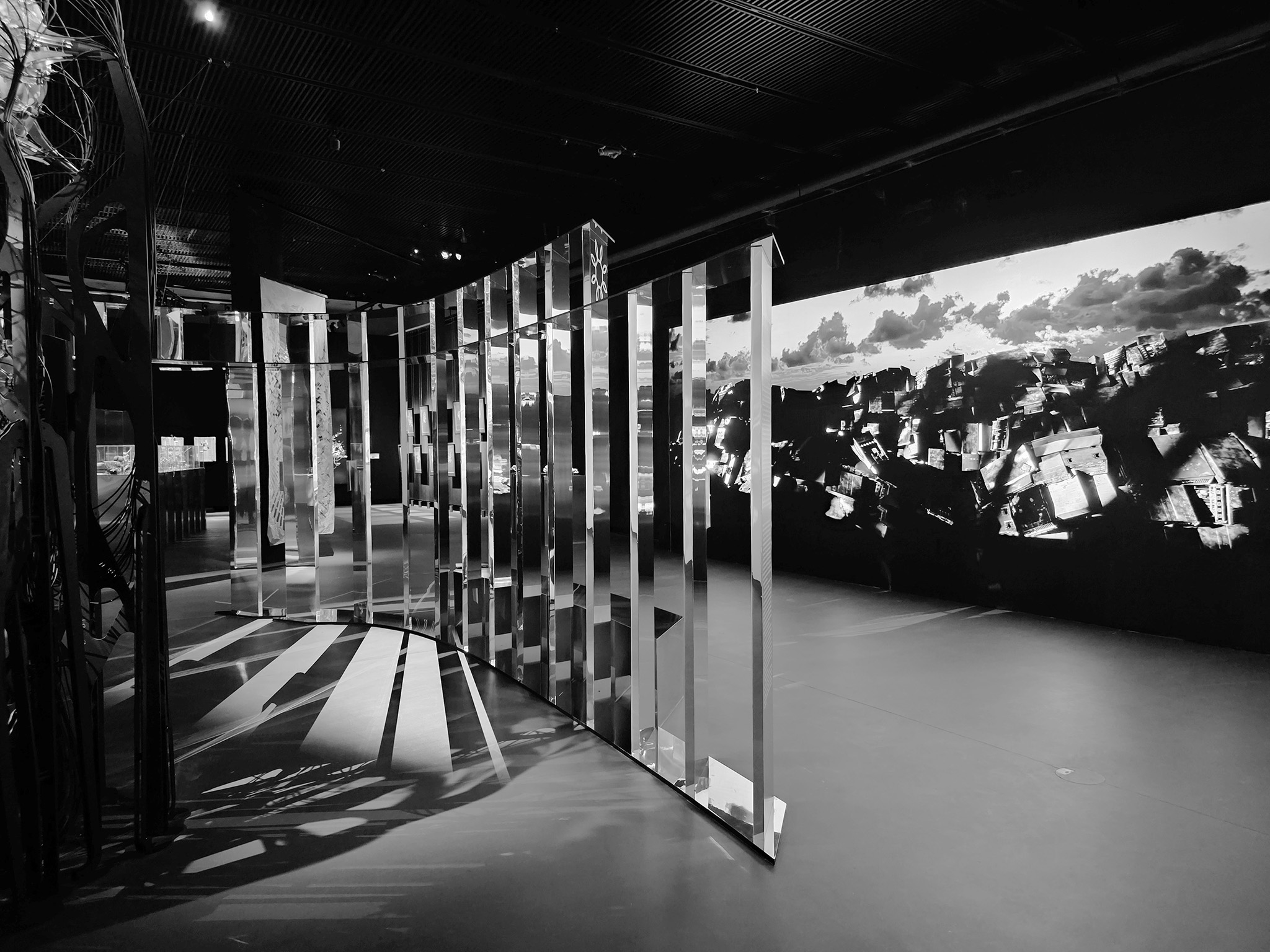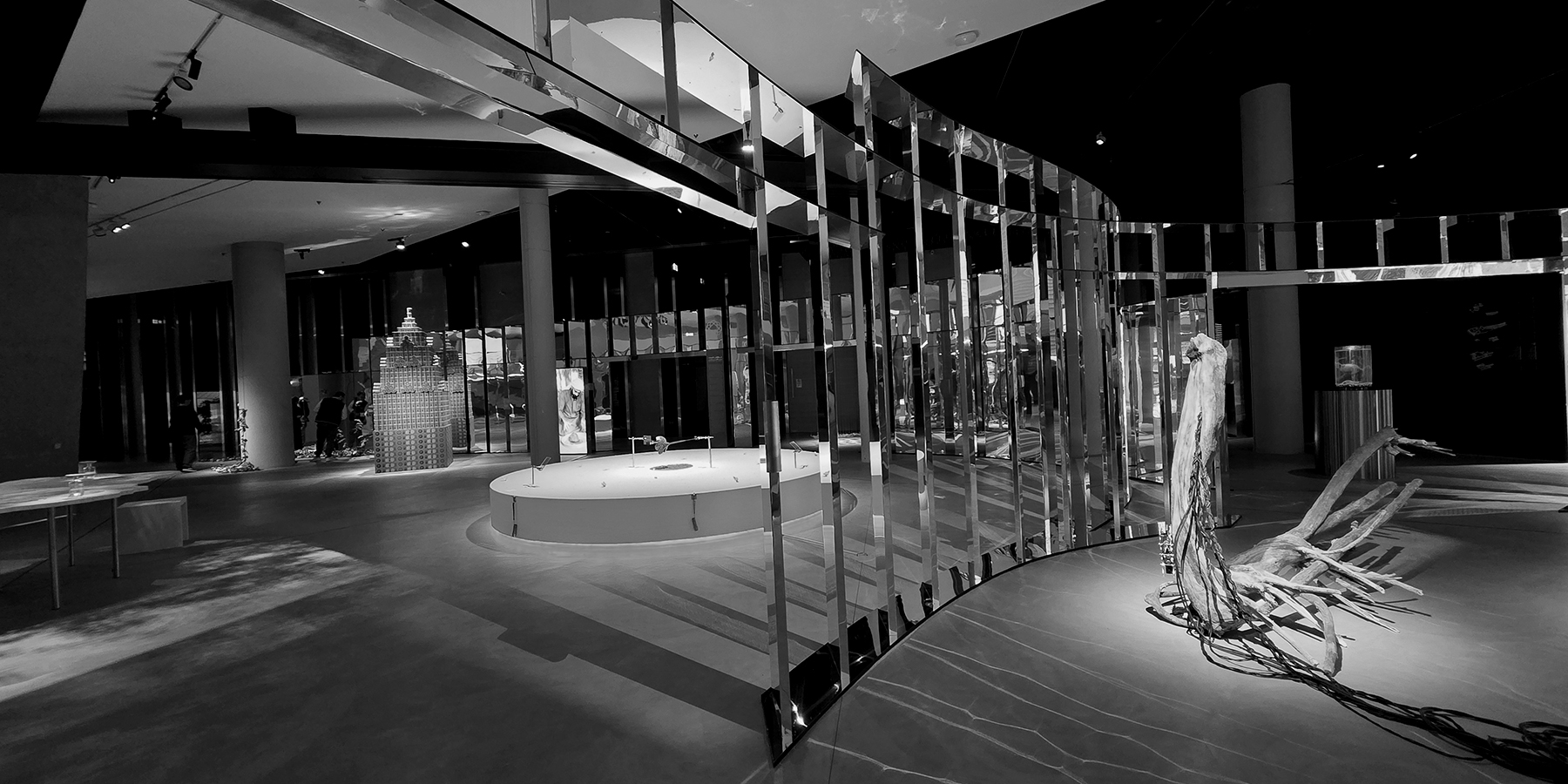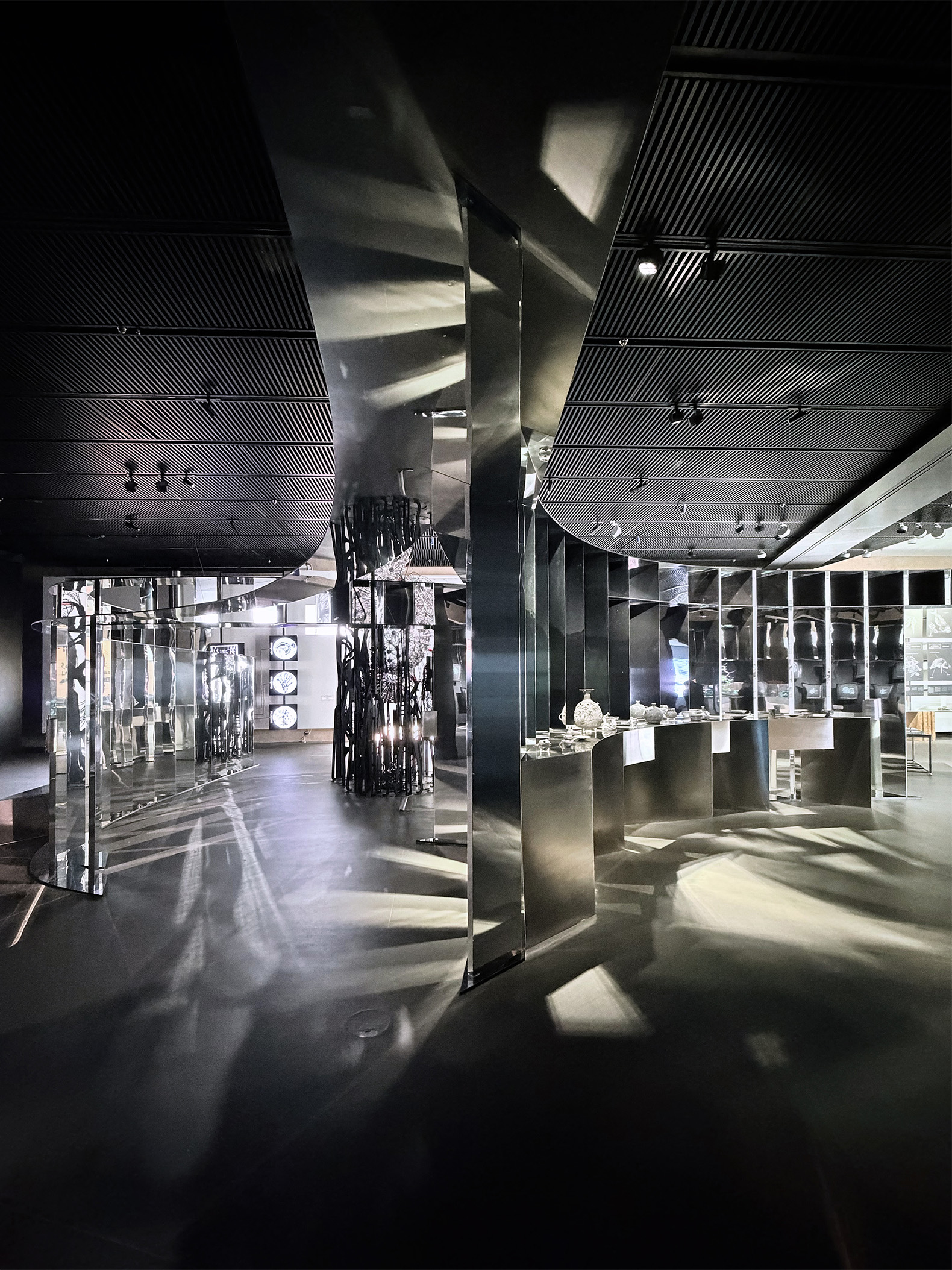 This geometry extends to bespoke scenographic elements, including plinths, counterweights, and display cases, whose formal rhythm and aesthetic language align with the central structure. Through reflection and repetition, the installation constructs a fluid perceptual field, where architecture transitions from a passive container into an active, mediating presence.