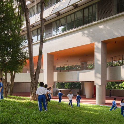 To reduce interference with the existing environment by the new buildings that make up the school, the classrooms proposed by Vector Architects are located around the perimeter, enclosing the small forest on their north, south and east sides. Public spaces are presented within the relatively compact mass of the building in the form of large semi-exterior terraces, offering shelter, shade and natural ventilation to the complex.