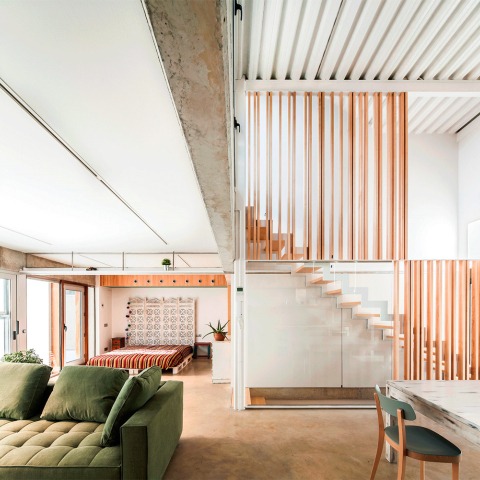 We have worked with neutral and rough materials: concrete, glass, polycarbonate, maple timber... trying to create a non contaminated space which allows the inhabitants to bring their own colour and personality with the chosen furniture, vegetation, paints, lamps, racks... in a way we are trying to project a daily life support.