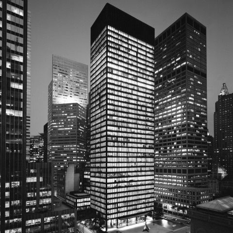 The 38-story Manhattan office skyscraper was designed between 1954 and 1958 by Ludwig Mies van der Rohe in association with Philip Johnson and is the most refined version of the modern glass tower. It faces Park Avenue across a broad plaza of pink Vermont granite, bordered on either side by reflecting pools and ledges of verd antique marble. The tower itself is a steel-framed structure wrapped in a curtain wall of pink-gray glass. Spandrels, mullions and I-beams, used to modulate the surface of the glass skin, are made of bronze. The walls and elevator banks are lined with travertine.