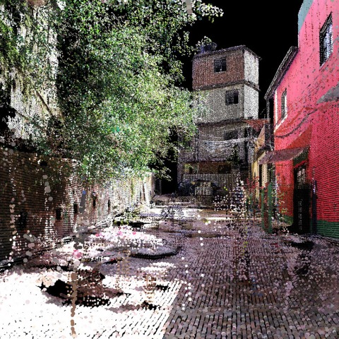 Favelas 4D, a project by MIT Senseable City Lab, in collaboration with Washington Fajardo, uses 3D laser scanning technology to analyze the morphology of Rocinha, the largest favela in Rio de Janeiro. Using detailed point cloud data from LiDAR (Light Detection and Ranging) scans taken at street level in the favela, researchers are able to quantitatively characterize morphological variation in this complex built environment at very high resolution. LiDAR uses a laser pulse to measure distances, mapping minuscule points to locations in space in order to create a dataset that describes a 3D environment with incredible precision.
