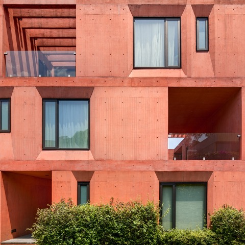 The material that dominates in the design is red pigmented concrete, in this way both the structure and the finishes emphasize the compact and integral character of the housing project.