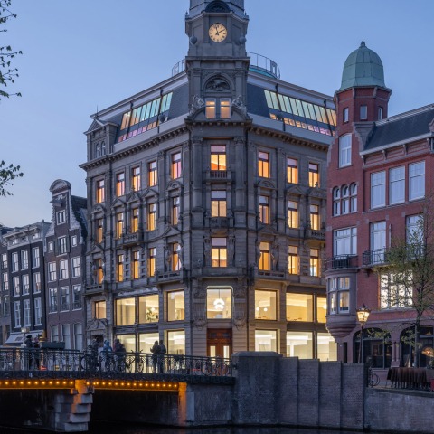 This gradual vertical change culminates in the top two floors. The walls of the sixth transition from gold to blue, leading into the sky-blue floor, finishes, and ceiling of the Rietveld pavilion. Here, the essence of this piece of modernist history is faithfully preserved, with refined finishes such as the carpet and curtains helping to make it an exquisite space for events such as galas and fashion shows – just as it was almost 100 years ago. The glass walls of Rietveld’s design give panoramic views over the rooftops of Amsterdam, completing the feeling of expansive lightness and giving space for visitors to reflect on the future to come.
