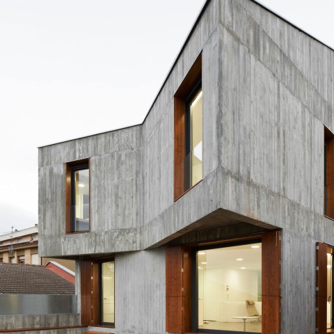 Anyway, the program answers common needs of a conventional home for a young couple with two young daughters, including a garage for two cars and a small garden and orchard. It is a monolithic volume, which emphasizes its archetypal geometry using concrete and stained pinewood. Any gesture is made to the better orientation and views, and to clear the plot as much as possible for the small garden and orchard to plant some vegetables and fruit trees. The house, therefore, is set at the highest level of the site. It follows a restrictive regulation on alignment and height. But this also permits to dominate the southern view towards the grain fields and smooth foothills of the River Ebro.