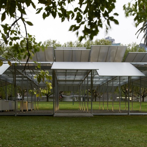 Funded primarily by the recently established Naomi Milgrom Foundation, with assistance and support from the Serpentine Gallery itself, the pavilion is the first step in the Naomi Milgrom Foundation's goal to position Melbourne as "Asia-Pacific’s hub of design and architecture." The first instalment by Godsell features a simple frame covered with automated aluminium panels, which open and close in response to the sunlight.