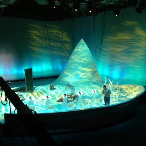 The set, designed and developed by MODO, will host different uses and elements in its large white surface projectable curve that bends as a sail to incorporate a large plasma screen, the center lectern and the contestant's chairs of this innovative program.