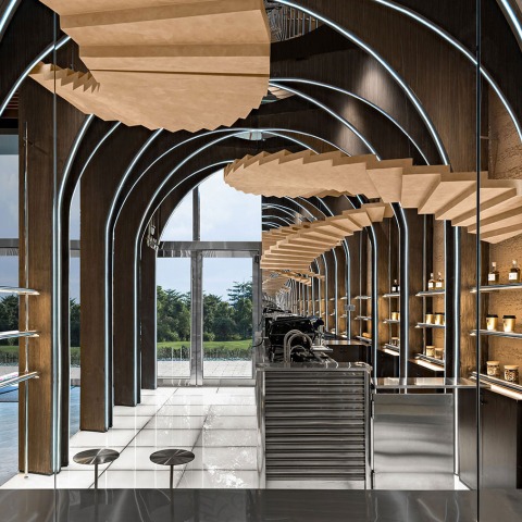 Four pairs of life-size wood spiral stairs echo each other overhead, threading through arches from a height and dominating the shop-in-shop. The entire space, thanks to the arches and stair structures, resembles an unfolded accordion that is waking up the folded time and space.