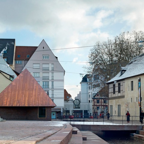 Between the two museum complexes, Unterlinden Square has recovered its historical significance, recalling the times when, across from the convent, stables and farm buildings formed an ensemble known as the “Ackerhof”. The bus stop and parking lot existing prior to the museum's renovation have now become a new public and urban space. The Sinn canal, which flows under Colmar’s old town, has been reopened, becoming the central element of this new public space. Close to the water, a small house marks the museum's presence on the square: its positioning, volume and shape are those of the mill that once stood there. Two windows allow passers-by to look downwards at the underground gallery connecting the two ensembles of buildings.