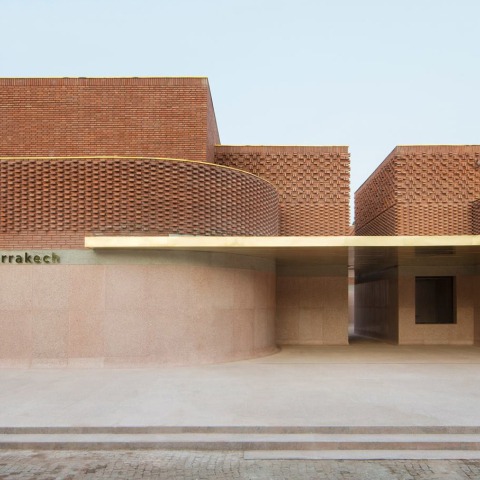 The facade of the building appears as an intersection of cubes with a lace-like covering of bricks, creating patterns that recall the weft and warp of fabric. As with the lining of a couture jacket, the interior is radically different: velvety, smooth and radiant. Its exterior incorporates terracotta brickwork designed to recall the warp and weft of fabric, as well as curved and angular volumes in earthen-coloured terrazzo that the French architects said reference the "succession of delicate and bold forms that characterised the work of Yves Saint Laurent".