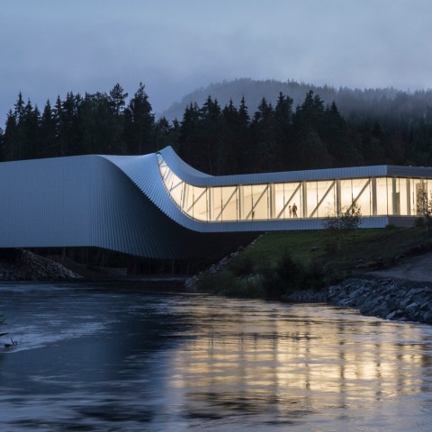 A glass stairway leads down to the museum’s lower level on the north river embankment, where the building’s aluminium underside becomes the ceiling for the basement and restroom area. Another full-width glass wall brings visitors even closer to the river below, enhancing the overall immersive experience of being in the idyllic woodlands outside of Oslo.