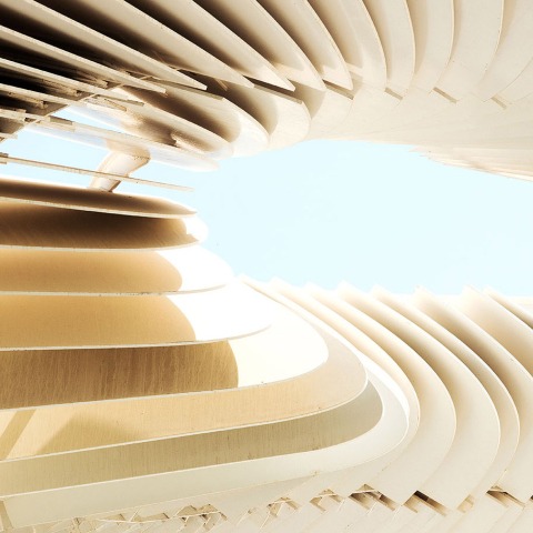 "On street level, the new market enhances the public setting by forming a dynamically shaded canopy, organizing the spaces beneath it. The canopy’s form is derived from the sinuous flow of Arabic calligraphy. It follows the logic of a playful movement of light and shadow built from aluminum fins which provide shade, natural ventilation, and an ephemeral appearance. The complexity of the canopy roof contrasts the simple solidity of the concrete structure below it," said the architects.