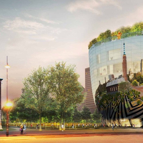 Today the city of Rotterdam, Museum Boijmans Van Beuningen and MVRDV present the design for the new Collection Building. The building with a surface of 15,000m2 is an open art depot featuring exhibition halls, a sculpture roof garden and a restaurant. The public can see what's going on behind the scenes in a museum and private art collectors will be able to store their own collection in ideal Museum conditions. The design – a reflective round volume – responds to its surroundings, Rotterdam's Museumpark in which it will be completed in 2017. The allocated budget is 50 million Euros.