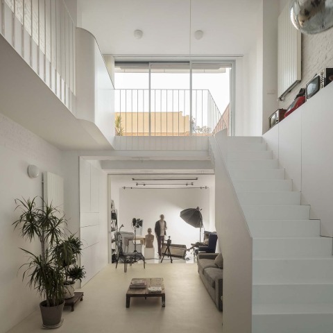 The first important decision of the project was the opening of a double space in a part of the slab next to the rear façade, which, due to the orientation of it, allows direct natural light to reach the entire home. The studio space is placed under the terrace, the darkest and therefore most suitable space, and on the other hand related to the living room.