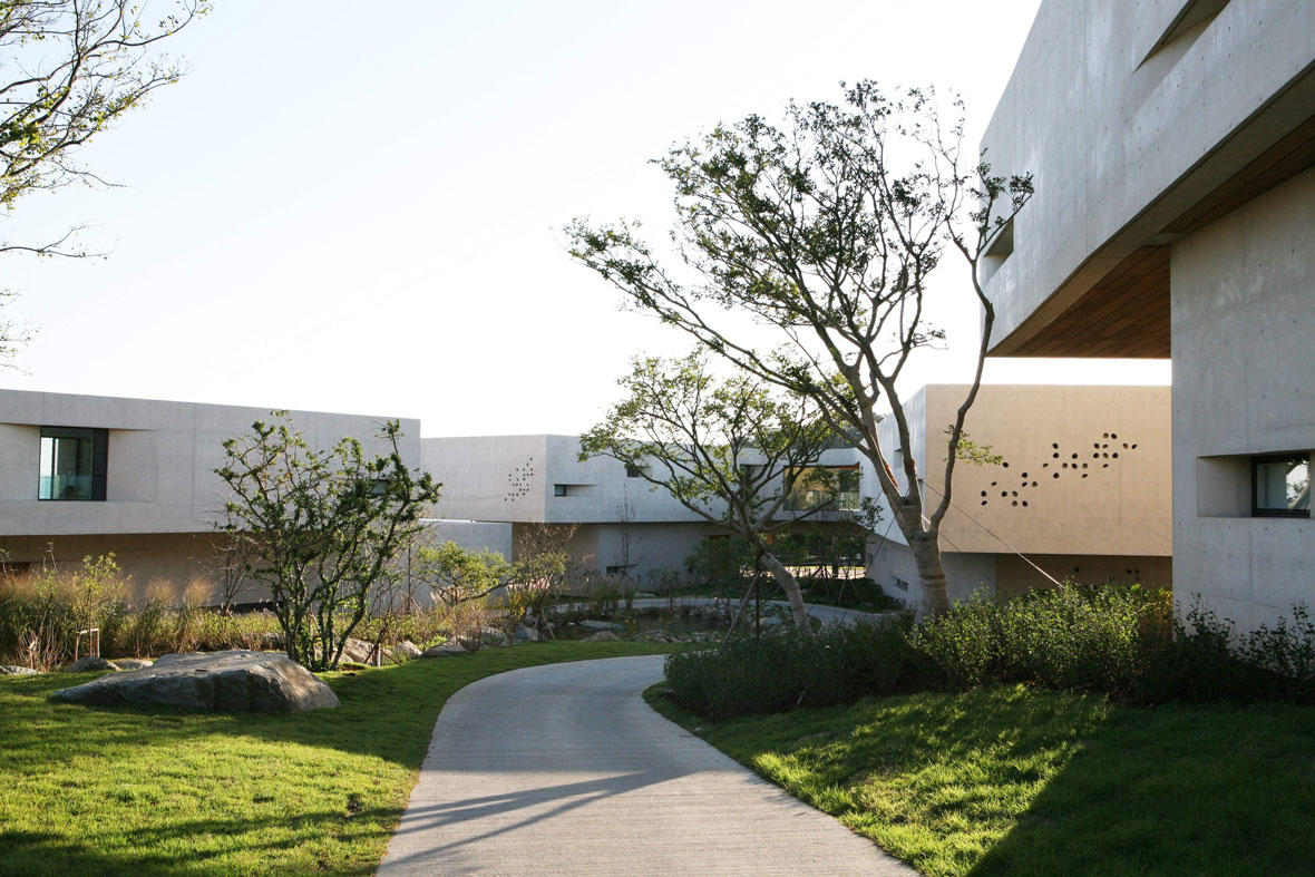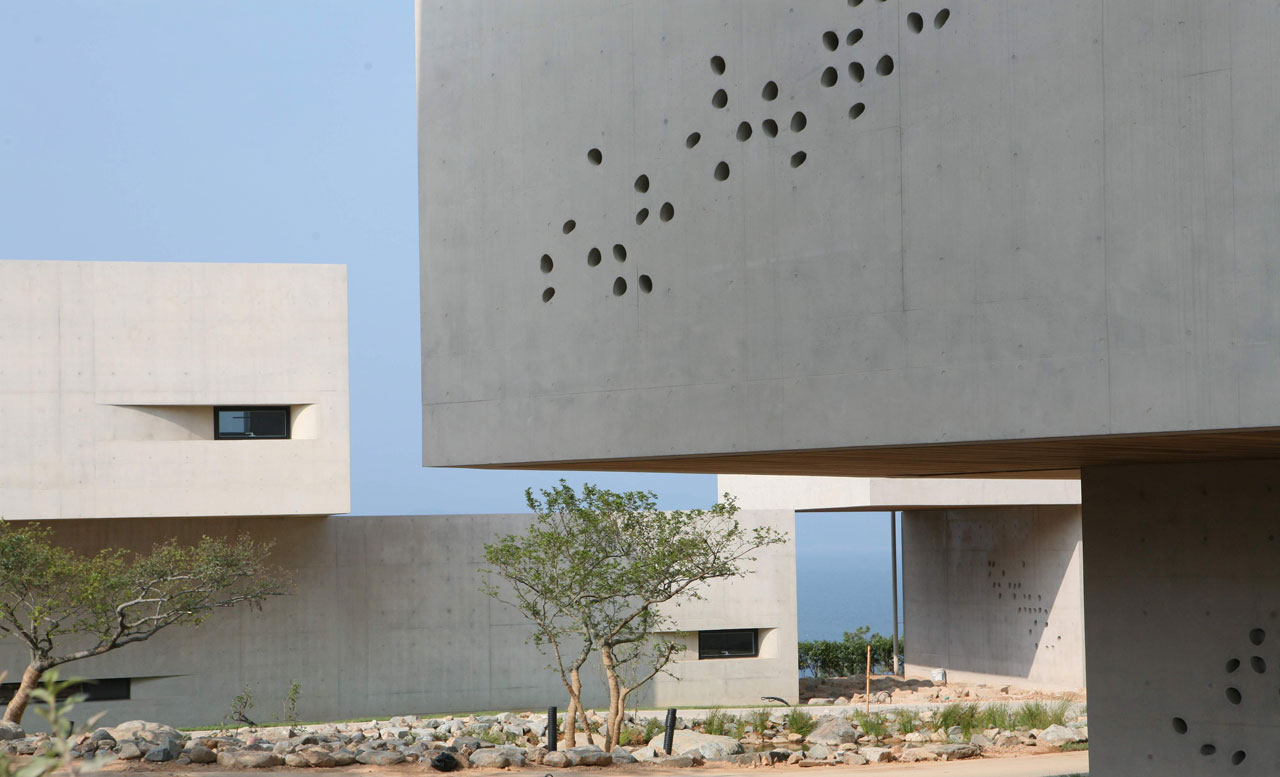 All buildings are composed of two linear boxes, intentionally kept low, disappearing into the site to allow for uninterrupted views southwards of the beautiful peninsula. These two storey masses are juxtaposed and cantilevered in order to frame views of the ocean, concurrently following the gradient of the natural topography. Additionally, the cantilevers have a functional use of protecting cars and pedestrians from the often extreme climatic conditions of the cape, creating a cool tunnel within the sloping hill. Elevations orientated towards the ocean are typified by maximum surface area allowance for windows, in contrast to hillside elevations where minimal windows produce an inherently high thermal efficiency. Resonating with the archaic principle of architecture as shelter, solid balconies provide protection from strong typhoons during the summer, forming deep punctuation in the solid masses of the hotel.