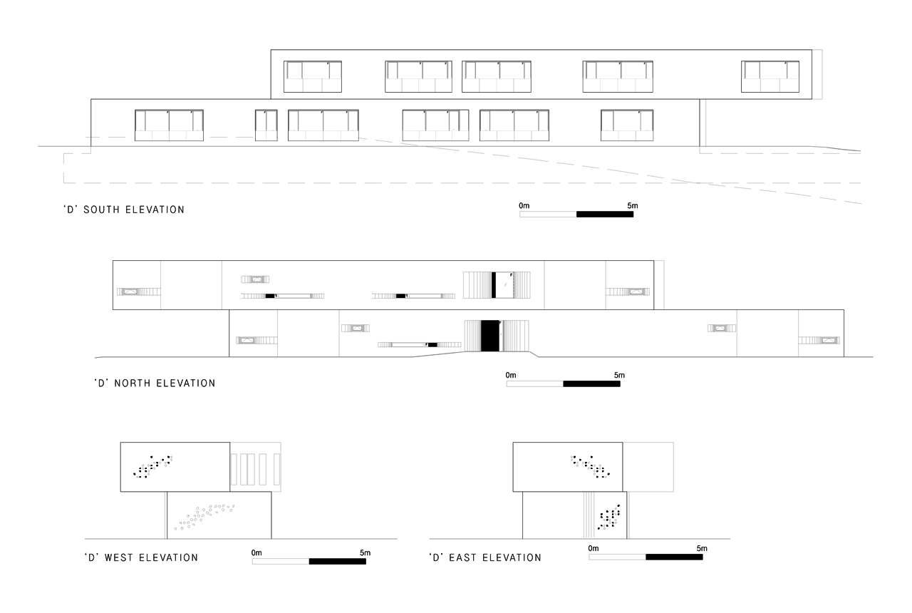 Primitive materials, with an emphasis on rawness, heighten the sense of an architecture having a resonance with the natural opposed to the artificial. The corridors use exposed concrete to the floor and whiles while black treated stainless steel adds to the distinct ambience inside these circulation spaces. Solid wood able to absorb the moisture of the sea air clads the guestroom roofs, the edges left exposed allowing the depth of the material to be perceived. Architectural juxtapositions dramatise the sequence of spaces that lead the inhabitant to there room. A phenomenological beauty is created through the dramatic contrast in dark spaces provided by the tunnel and corridors with the intense daylight found in the guestrooms.