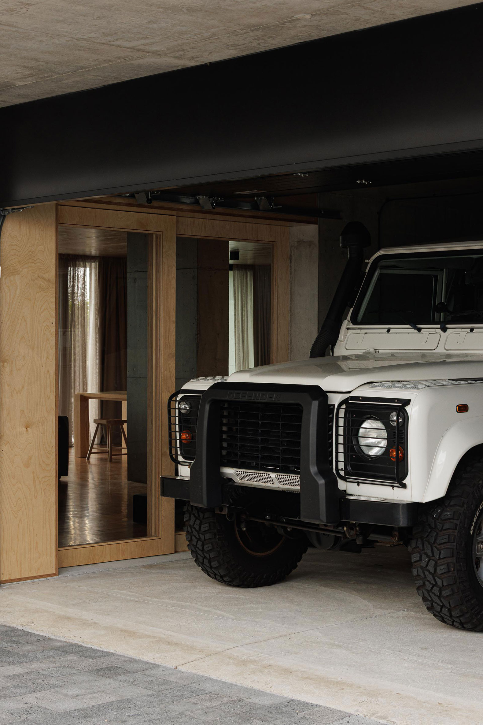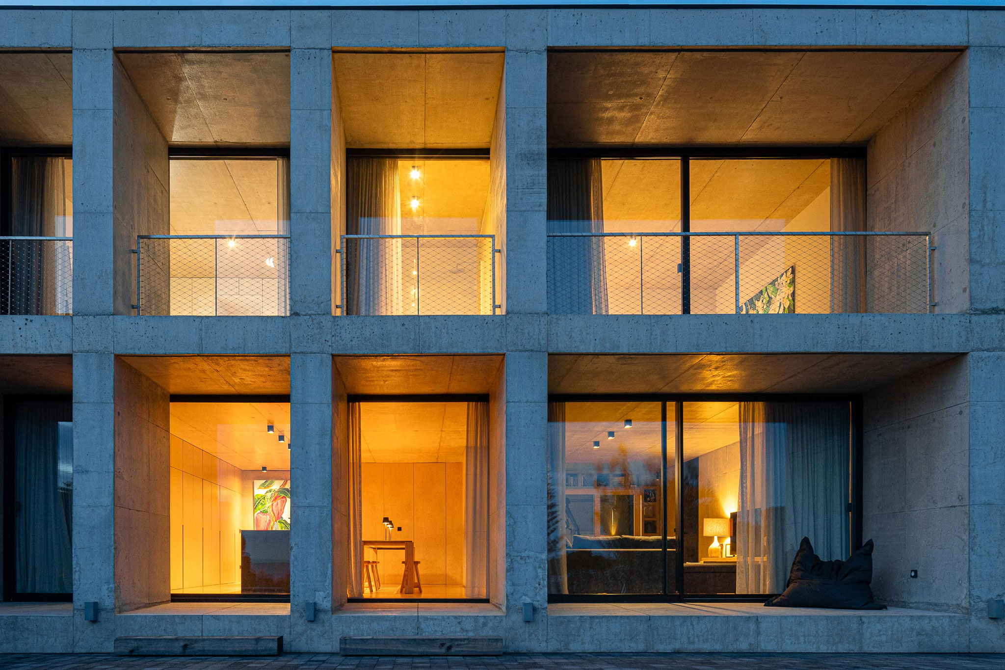 The choice of exposed concrete was obvious. A material resistant to time and salt. Raw, but honest. The building presents itself to the street as a mineral mass composed of solids and voids. The recessed and protected openings reveal little of the interior. From the outside, the house seems almost uninhabitable: a recent ruin, a sequence of caves in Rocha Quebrada. But these caves are habitable. Inside, the wood warms the space and contrasts with the coolness of the concrete. The layout is simple: three bedrooms, an open and flowing social area, with natural ventilation and light thanks to a central courtyard that runs through the building. Anything non-essential is absent.