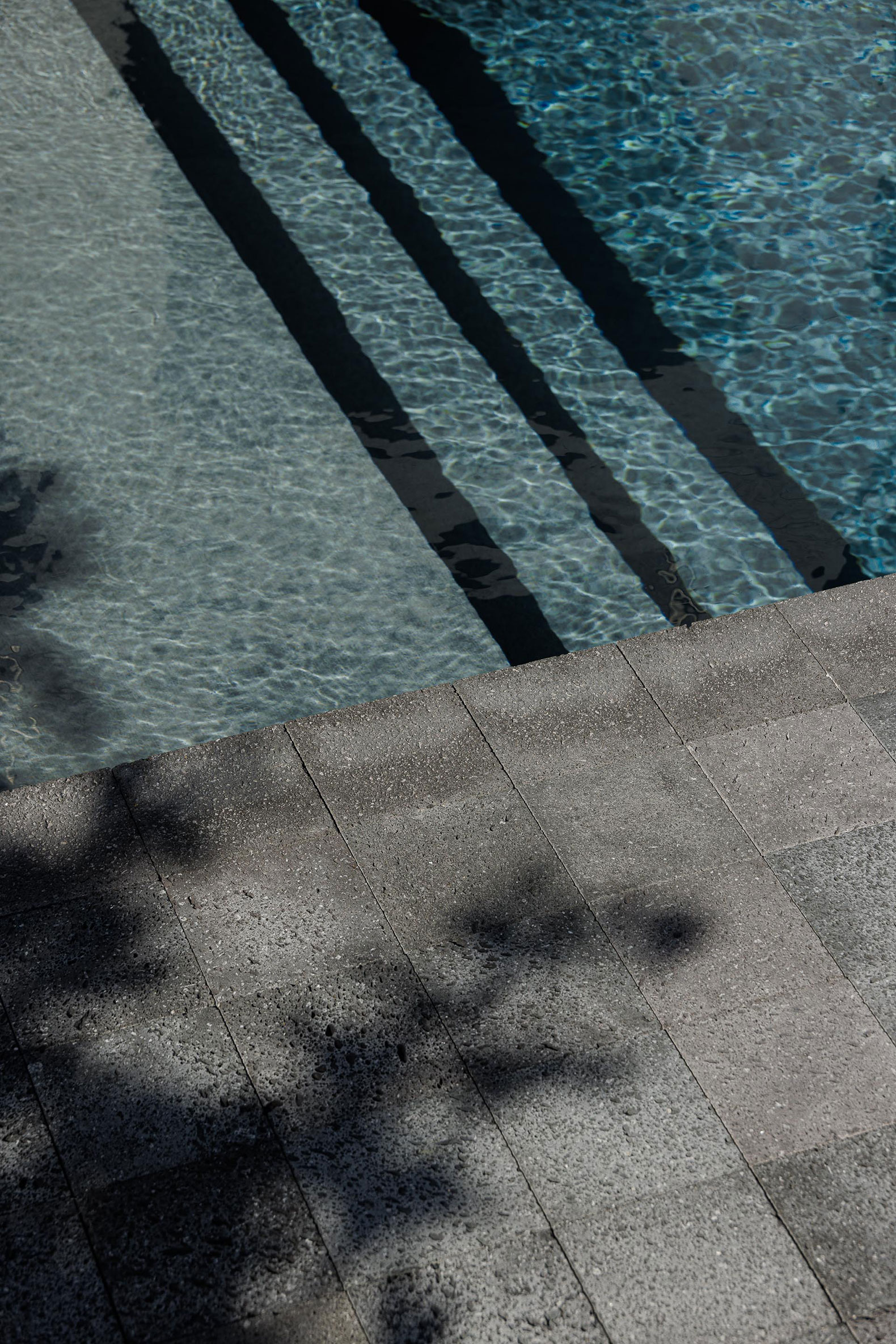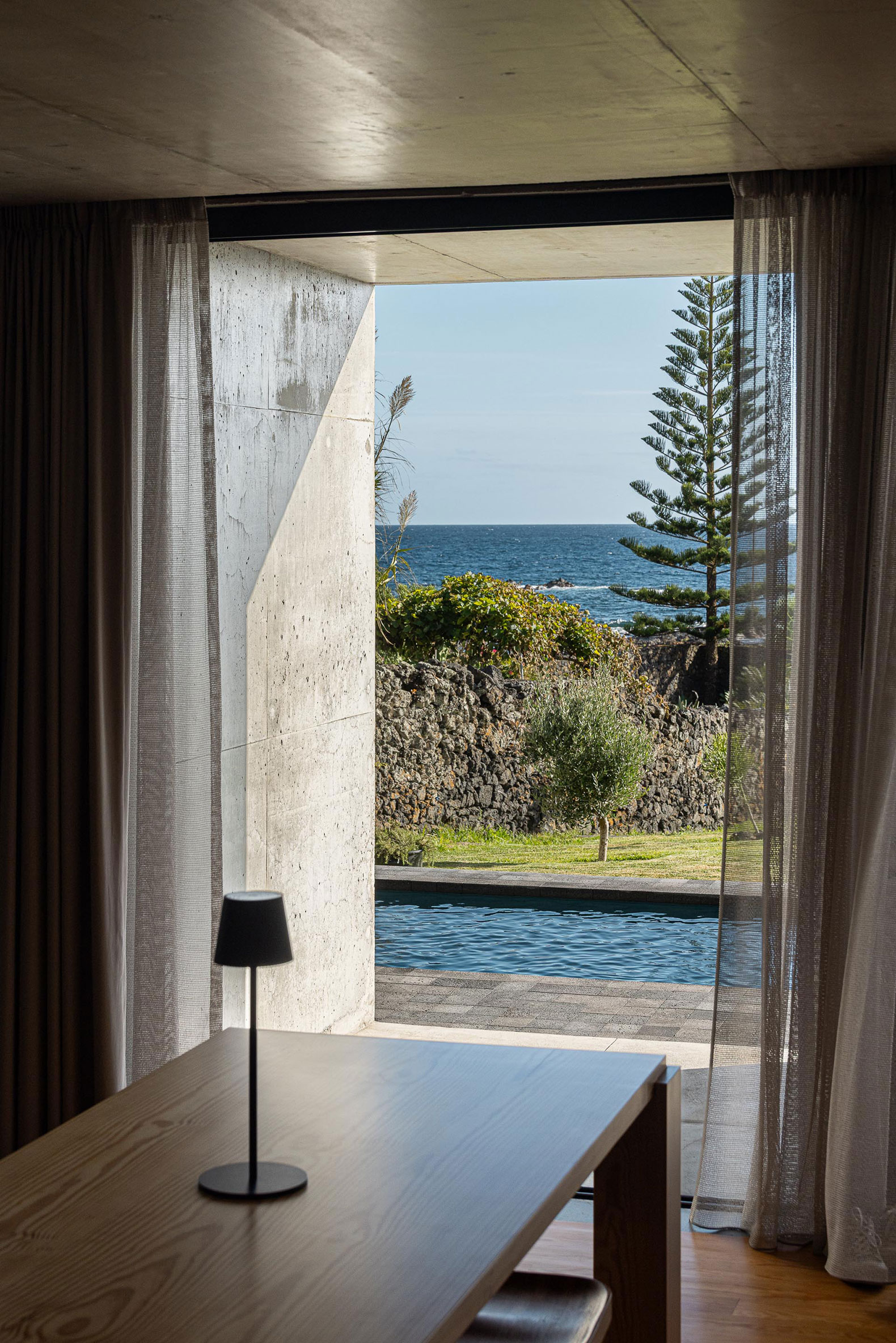 On the south side, the house opens to the sea, but without ostentation. The views are always present, discreetly filtered through the structure. From the natural pools in front, the building appears quiet and unassuming, just stone, light, and shadow.