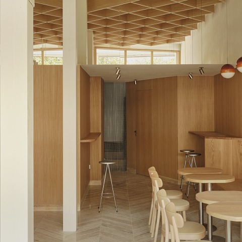 To bring this vision to life, we developed the interior around a key geometric element: the rotated square, or diamond shape. This motif is applied consistently across ceilings, floors, and the façade, crafting a unique visual identity throughout the space.