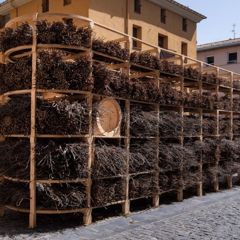 The square will be filled with more than 1,200 bundles of vine shoots gathered in a wooden structure to form a seating area, a raised gazebo overlooking the street and a communal table with benches. Anyone can take part in this central meal. All you have to do is open the windows overlooking the square. This creates a human arena suspended above street level. It is a “convivium”, an event that goes beyond the simple everyday act of eating.