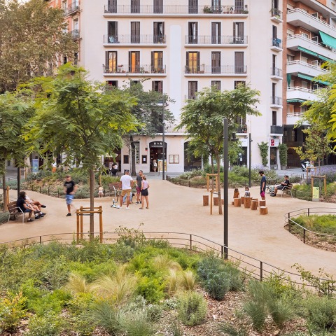 The Green Axes Project proposed the pedestrianization and re-naturalization of one out of every three streets in the Eixample district of Barcelona, with the aim of transforming twenty-one streets into green axes and twenty-one crossroads into squares within ten years. The project was stopped in 2023, after the completion of the works on four axes and four squares, one of them located at the crossroads of Consell de Cent and Rocafort streets.