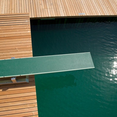 The Swiss municipality of Riehen, bordering the city of Basel, lies in the gently widening valley of the River Wiese, near to its confluence with the Rhine. For decades, the local population has yearned for a new public swimming pool to replace the obsolescent baths by the riverbank, with various attempts having failed. After winning a design competition in 1979 and several unrealised projects in the following years, Herzog & de Meuron again started to ponder the options for a new bathing facility. The changed perspectives brought by the intervening years prompted the idea of abandoning the conventional pool concept with its mechanical and chemical water treatment systems in favour of a pool closer to a natural condition with biological filtration. This approach was publicly discussed by the citizens of Riehen and officially approved by a municipal vote. The standard geometric swimming pool transforms into a bathing lake where the technical systems and machine rooms vanish, to be substituted by planted filtering cascades. This concept led to the notion of modelling the natural pool on the local “Badi”, Basel’s traditional wooden Rhine-side baths, which combine a lively atmosphere with a timeless appearance.