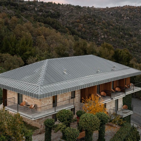 In the main building, the original configuration was kept (implantation, height), as well as the main walls in granite masonry and the elements that characterize it, with only the reconfiguration of the old and "fragmented" roof, the removal of plasters, joints and cement walls, and other compositions that presented some level of degradation. The vegetation was also maintained, both in the immediate surroundings and in the building, so that this entire pre-existing body preserved the original vernacular, only enhanced with subtle interventions of a more contemporary nature, such as the introduction of elements in exposed concrete, thermo-treated wood and natural zinc plating.